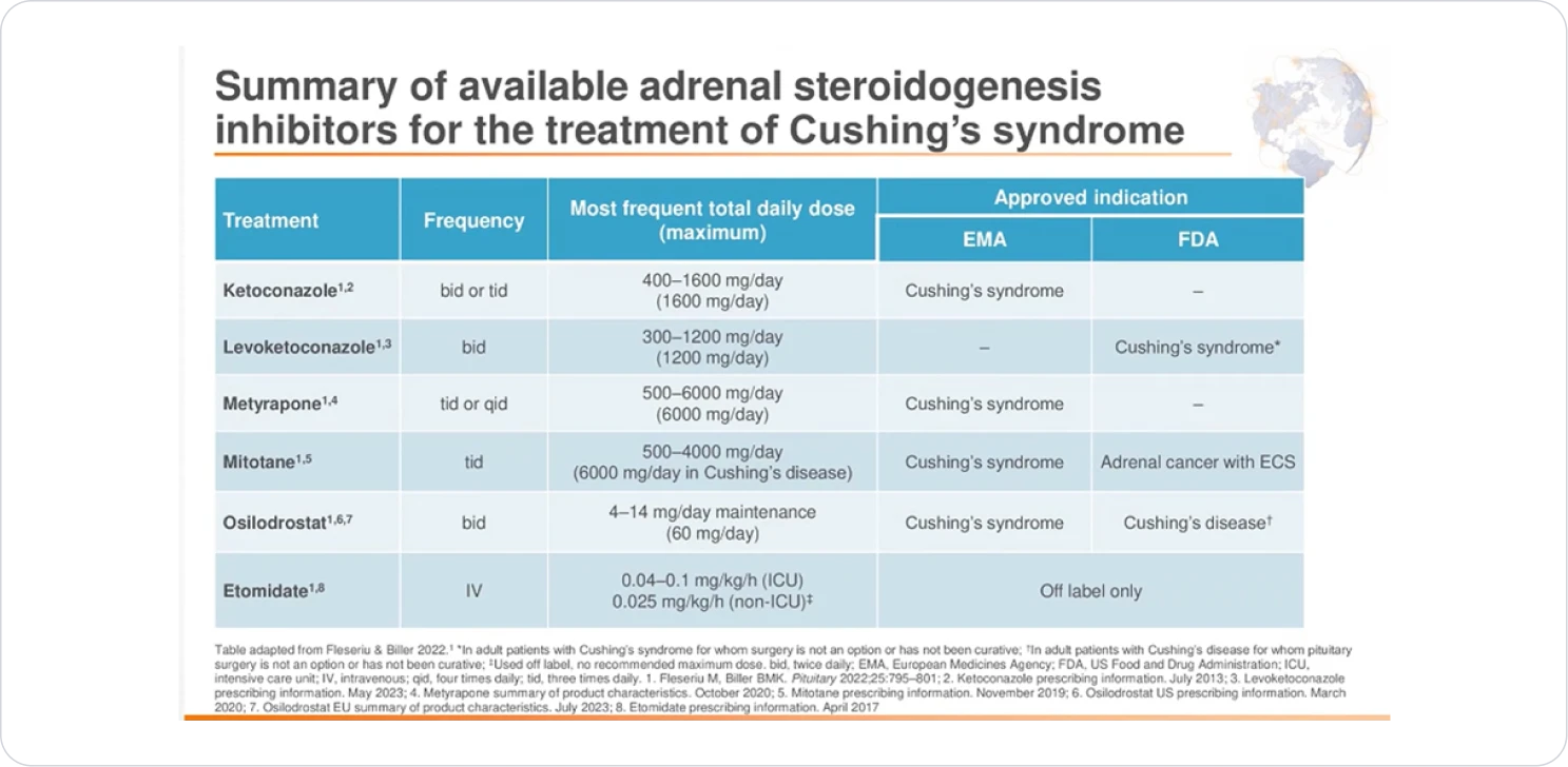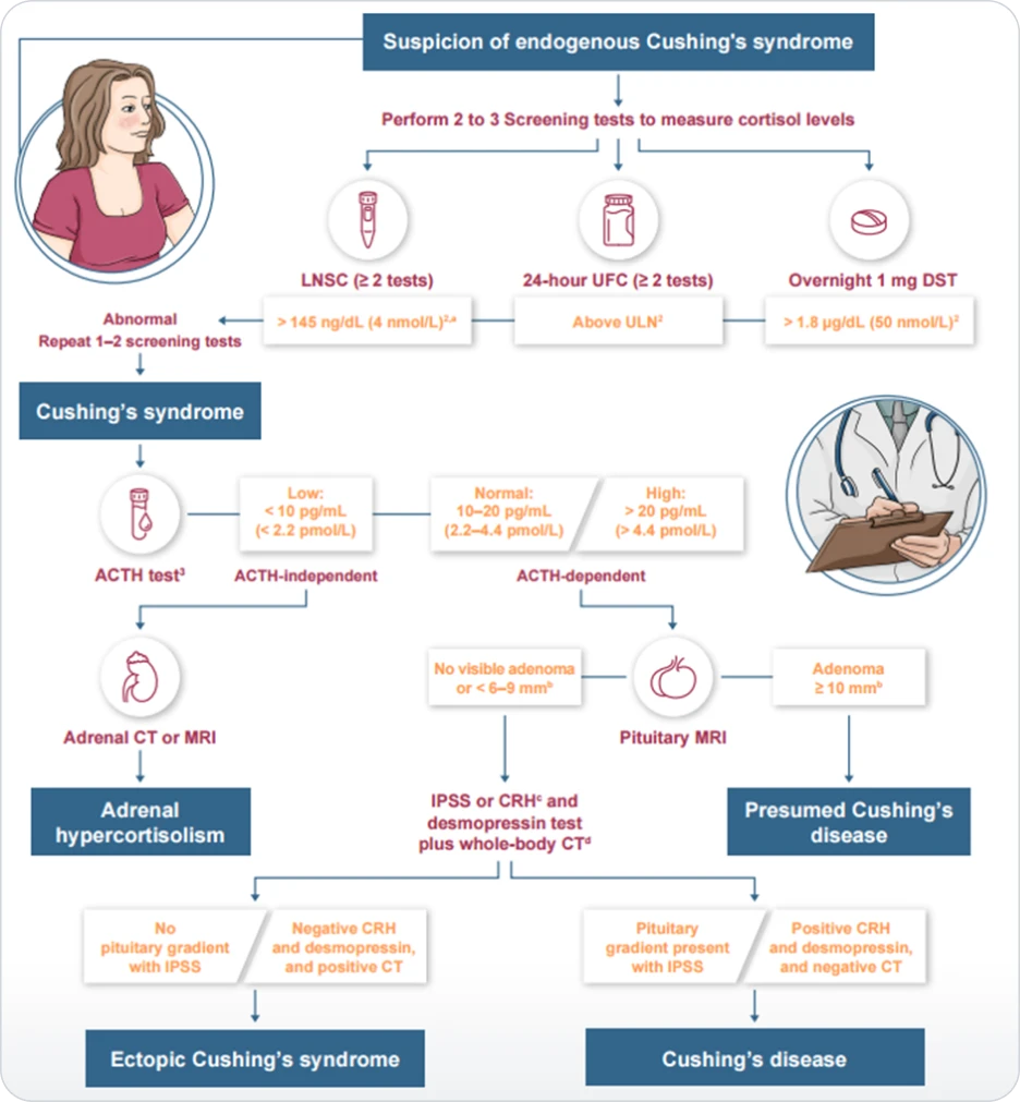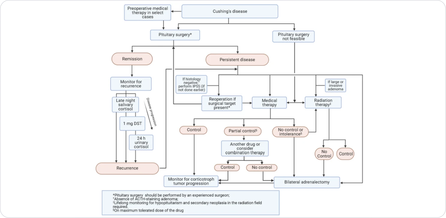 Sharma ST, Nieman LK, Feelders RA. Cushing’s syndrome: epidemiology and developments in disease management. Clin Epidemiol. 2015;17(7):281-293. doi:10.2147/CLEP.S44336 2. Lonser RR, Nieman L, Oldfield EH. Cushing’s disease: pathobiology, diagnosis, and management. J Neurosurg. 2017;126(2):404-417. doi:10.3171/2016.1.JNS152119 3. Giuffrida G, Crisafulli S, Ferraù F, et al. Global Cushing's disease epidemiology: a systematic review and meta-analysis of observational studies. Endocrinol Invest. 2022;45(6):1235-1246. doi:10.1007/s40618-022-01754-1 4. Nishioka H, Yamada S. Cushing's disease. Clin Med. 2019;8(11):1951. doi:10.3390/jcm8111951 5. Feelders RA, Pulgar SJ. Kempel A, Pereira AM. The burden of Cushing's disease: clinical and health-related quality of life aspects. Eur J Endocrinol. 2012;167(3):311-326. doi:10.1530/EJE-11-1095 6. Pivonello R, De Leo M, Cozzolino A, Colao A. The Treatment of Cushing's Disease. Endocr Rev. 2015 Aug;36(4):385-486. doi:10.1210/er.2013-1048 7. Nieman LK, Biller BMK, Findling JW. et al. Treatment of Cushing's syndrome: an Endocrine Society clinical practice guideline. Endocrine. 2015;100(8):2807-2831. doi:10.1210/jc.2015-1818 8. Fleseriu M, Auchus R, Bancos I, et al. Consensus on diagnosis and management of Cushing's disease: a guideline update. Lancet Diabetes Endocrinol. 2021;9(12):847-875. doi:10.1016/S2213-8587(21)00235-7 9. Dekkers OM, Biermasz NR, Pereira AM, et al. Mortality in patients treated for Cushing's disease is increased, compared with patients treated for nonfunctioning pituitary macroadenoma. J Clin Endocrinol Metab. 2007;92(3):976-981. doi:10.1210/jc.2006-2112 10. Lacroix A, Feelders RA, Stratakis CA, Nieman LK. Cushing's syndrome. Lancet. 2015;386(9996):913-927. doi:10.1016/S0140-6736(14)61375-1 11. Fleseriu M, Castinetti F. Updates on the role of adrenal steroidogenesis inhibitors in Cushing’s syndrome: a focus on novel therapies. Pituitary. 2016;19(6):643-653. doi:10.1007/s11102-016-0742-1 12. Dekkers OM, Horváth-Puhó E, Jørgensen JOL, et al. Multisystem morbidity and mortality in Cushing’s syndrome: a cohort study. J Clin Endocrinol Metab. 2013;98(6):2277-2284. doi:10.1210/jc.2012-3582 13. van Haalen FM, Broersen LHA, Jørgensen JO, Pereira AM, Dekkers OM. Management of endocrine disease: Mortality remains increased in Cushing’s disease despite biochemical remission: a systematic review and meta-analysis. Eur J Endocrinol. 2015;172(4):R143-R149. doi:10.1530/EJE-14-0556