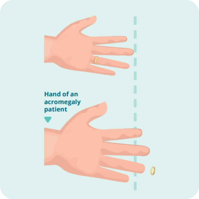 The most common symptom of acromegaly is abnormal growth of the hands and feet.7 With swelling of the hands and feet being an early symptom of the condition, people with acromegaly might notice that their rings or shoes have become too tight. Over time, as the bones continue to grow, facial features begin to change.